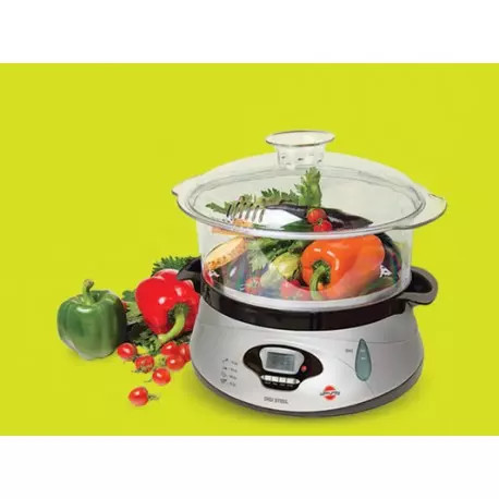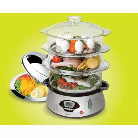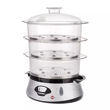 توان مصرفي: 650 وات، 3 طبقه، ظرفیت 13 ليتر، امكان طبخ همزمان انواع غذاها (مرغ، ماهي و گوشت، تخم مرغ، سبزيجات)