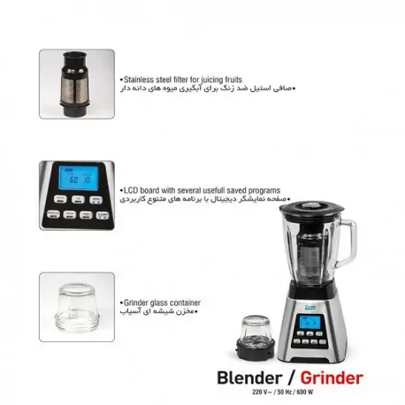 توان نامي 600 وات، داراي 10 سرعت مختلف، داراي صفحه نمايش LCD به رنگ آبی، دارای 8 برنامه ذخیره شده در برد، پارچ شيشه اي براي مخلوط كن به حجم 1.5 ليتر ظرف شيشه اي آسياب، تيغه شش پر مخلوط كن